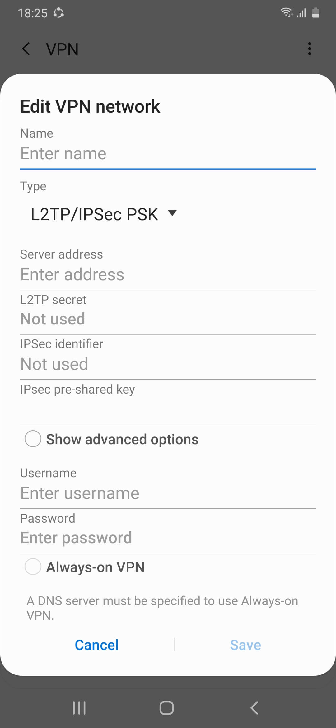 Settings > More > VPN > Add VPN > Add L2TP IPSec/PSK VPN