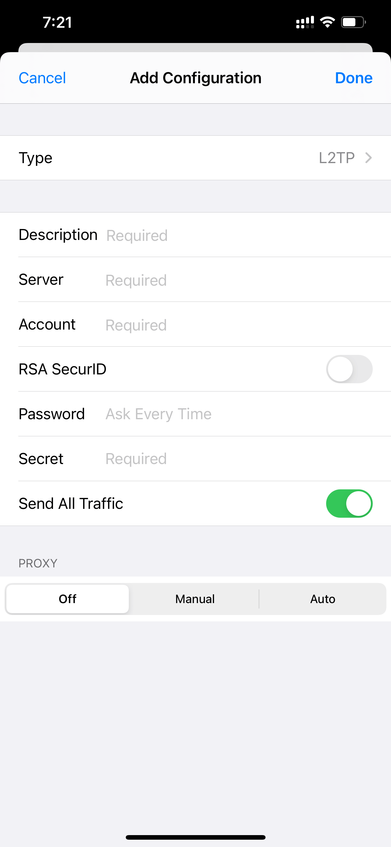 Setting > General > VPN > Add VPN Configuration > L2TP